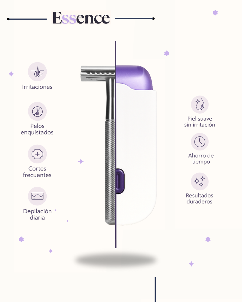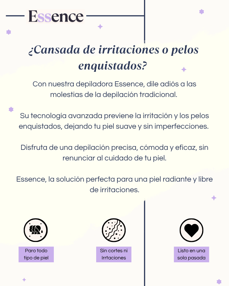 Antes usaba cuchillas y siempre me quedaba la piel roja e irritada. Desde que probé Essence, la diferencia es brutal. La piel me queda suave, sin marcas, ¡y sin ningún tipo de irritación! Estoy encantada.